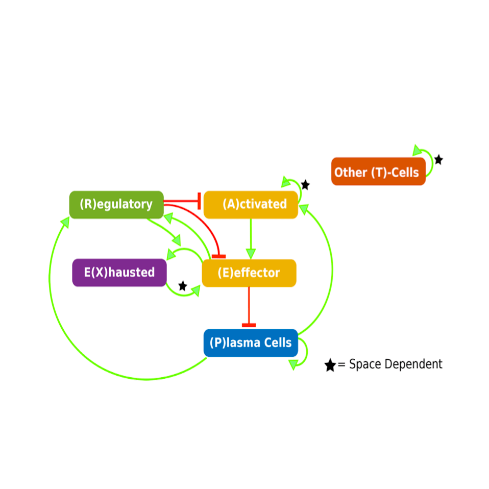 Methods for determining key components in a mathematical model for tumor-immune dynamics in multiple myeloma